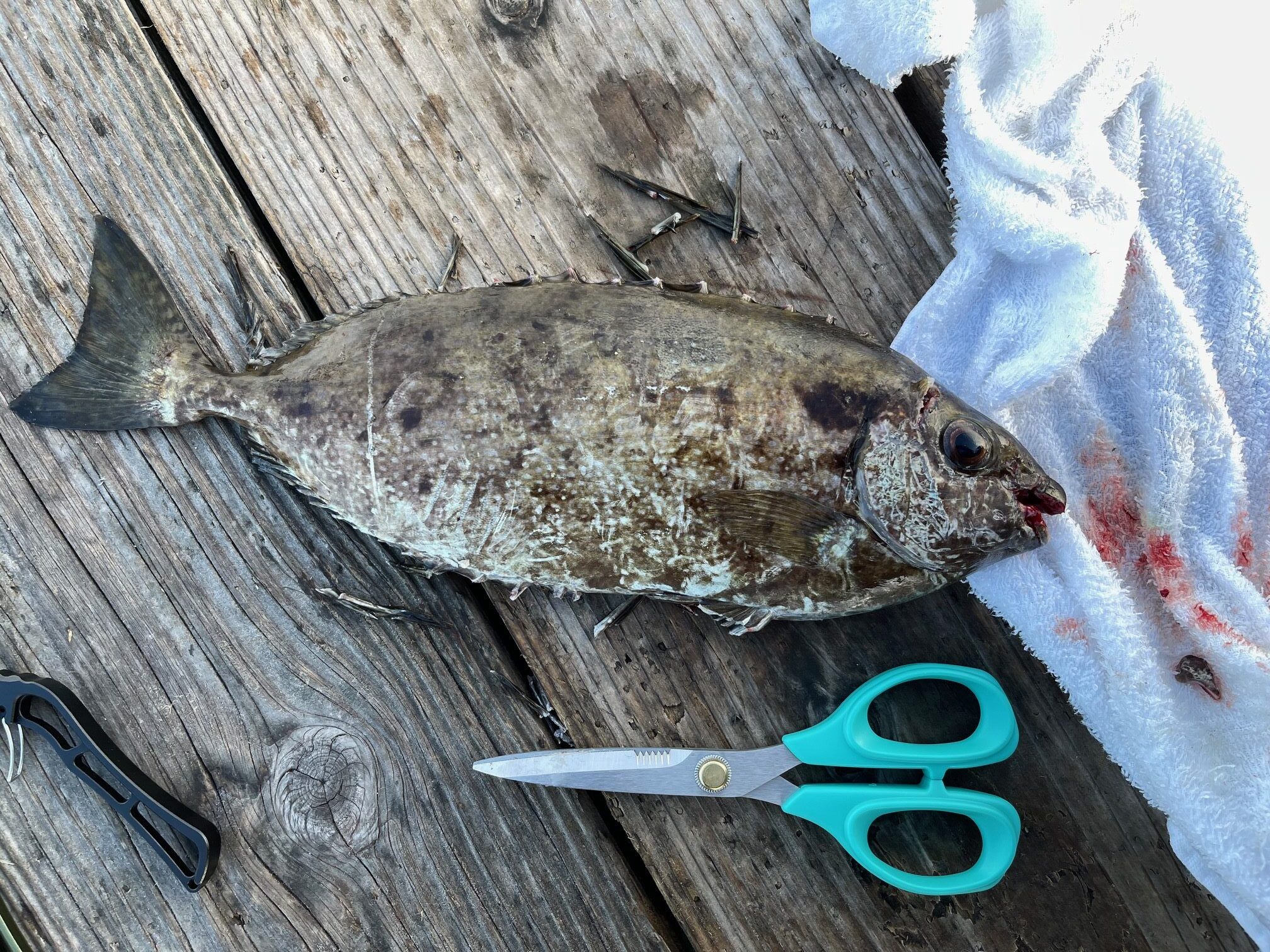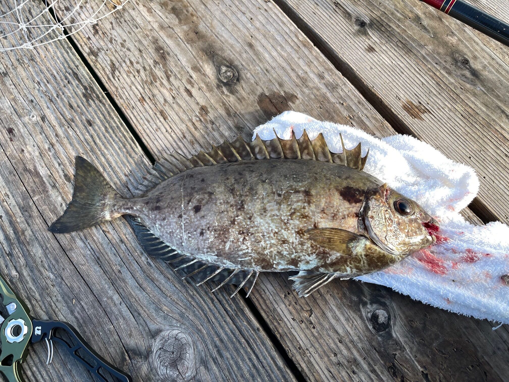 ママ:オリーブハマチ(メジロサイズ)1匹 3点、メジロ1匹 3点、デカアイゴ1匹 0点合計、ちびカワハギ2匹 0点、合計 6点
