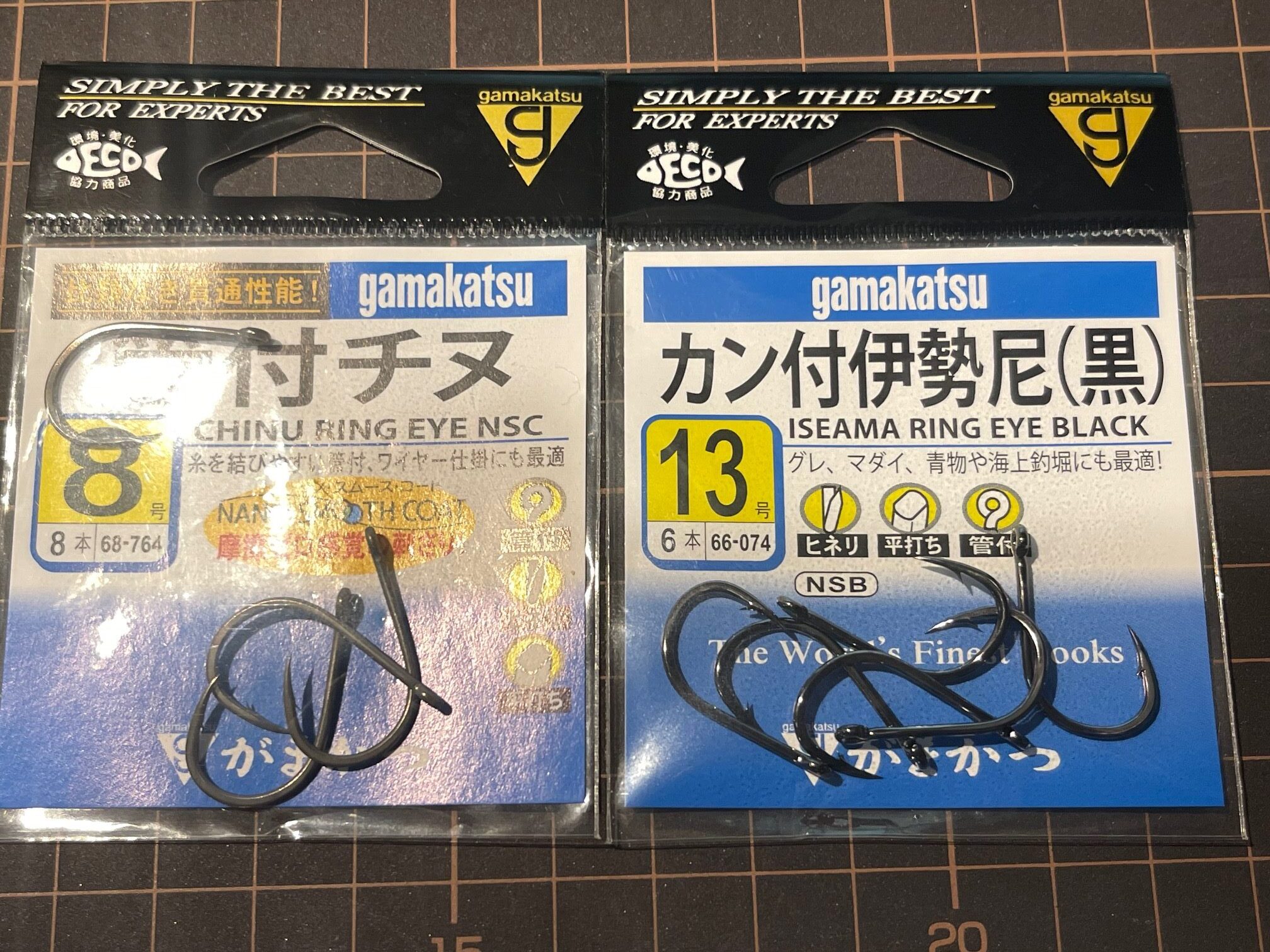 最初は、定番で太い目の伊勢尼11~13号を使っていましたが最近では、細いチヌ針が多いです。