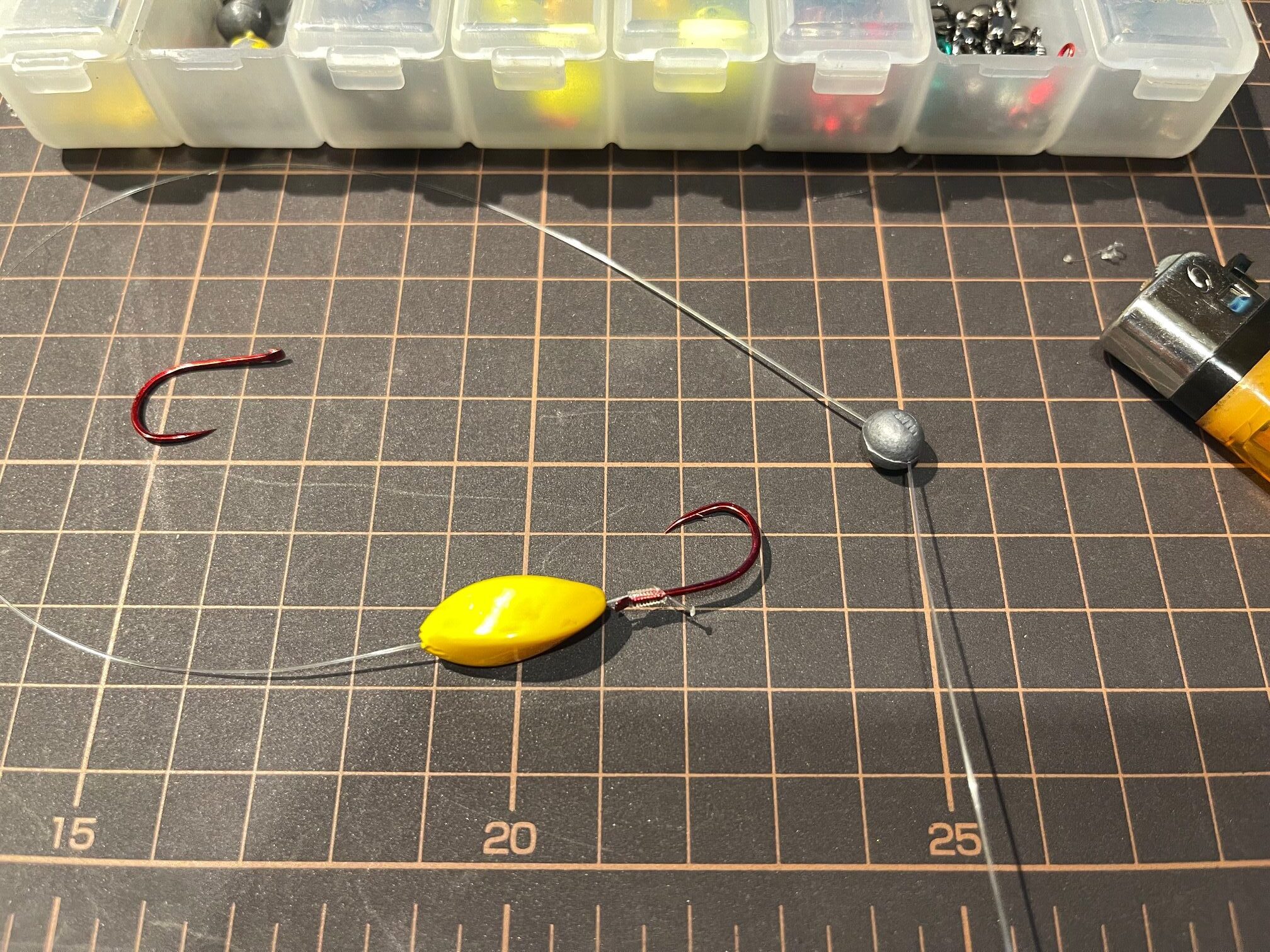 黄色い自作ビーズ付けて仕掛1個出来上がり。