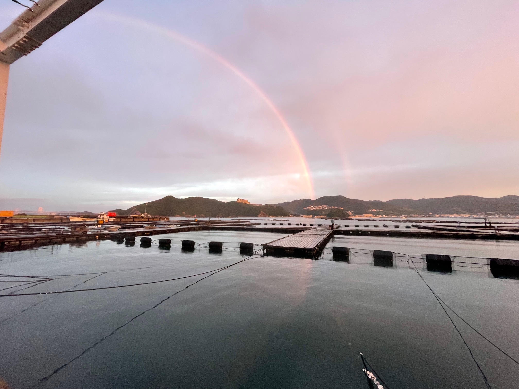 少し早く海上釣堀に着くと小雨で虹が出ていました。