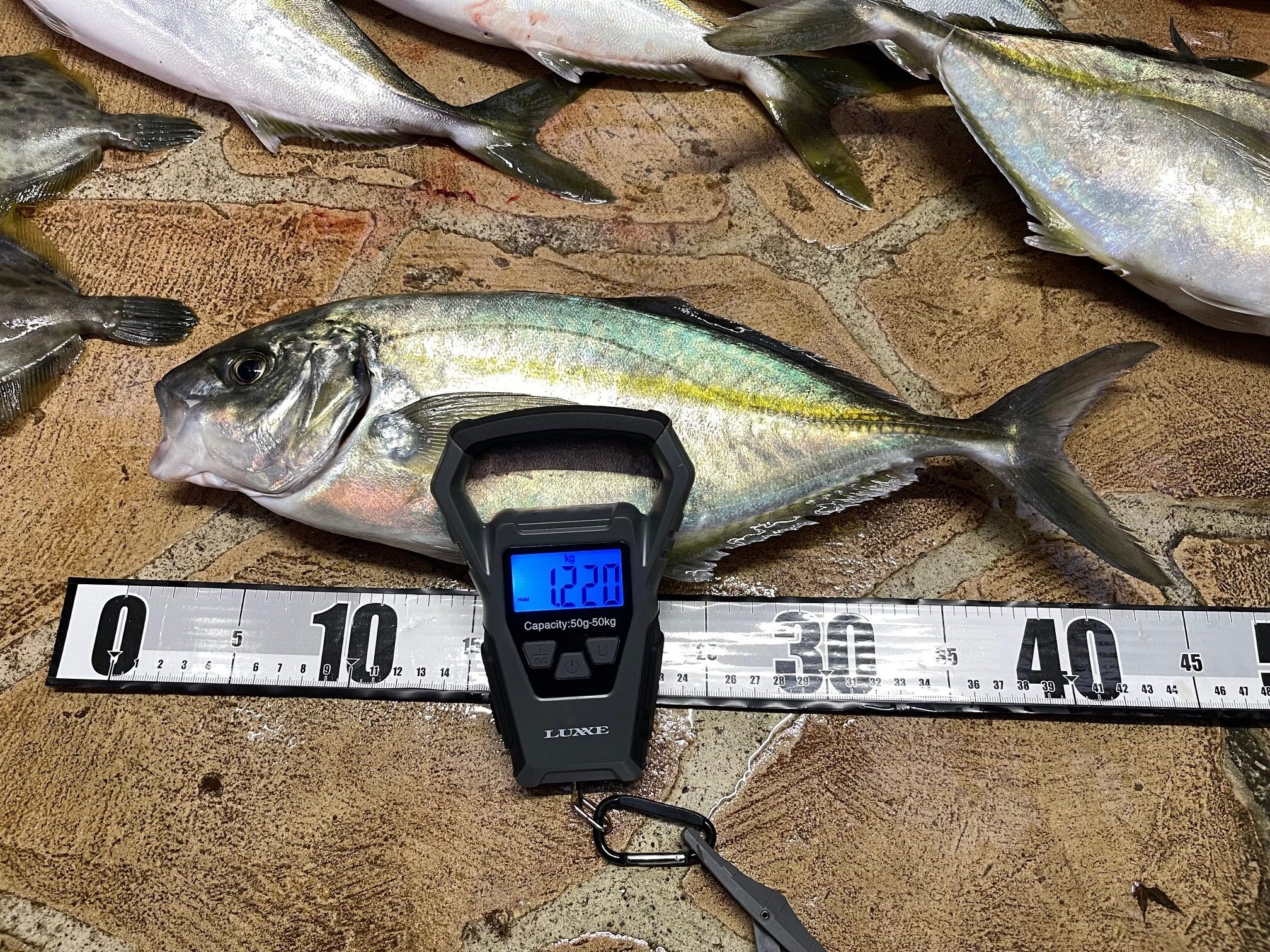 今回、パパが釣ったシアアジは、大きかったので計って見ると45cm、1,220kgと1,230kgでした。