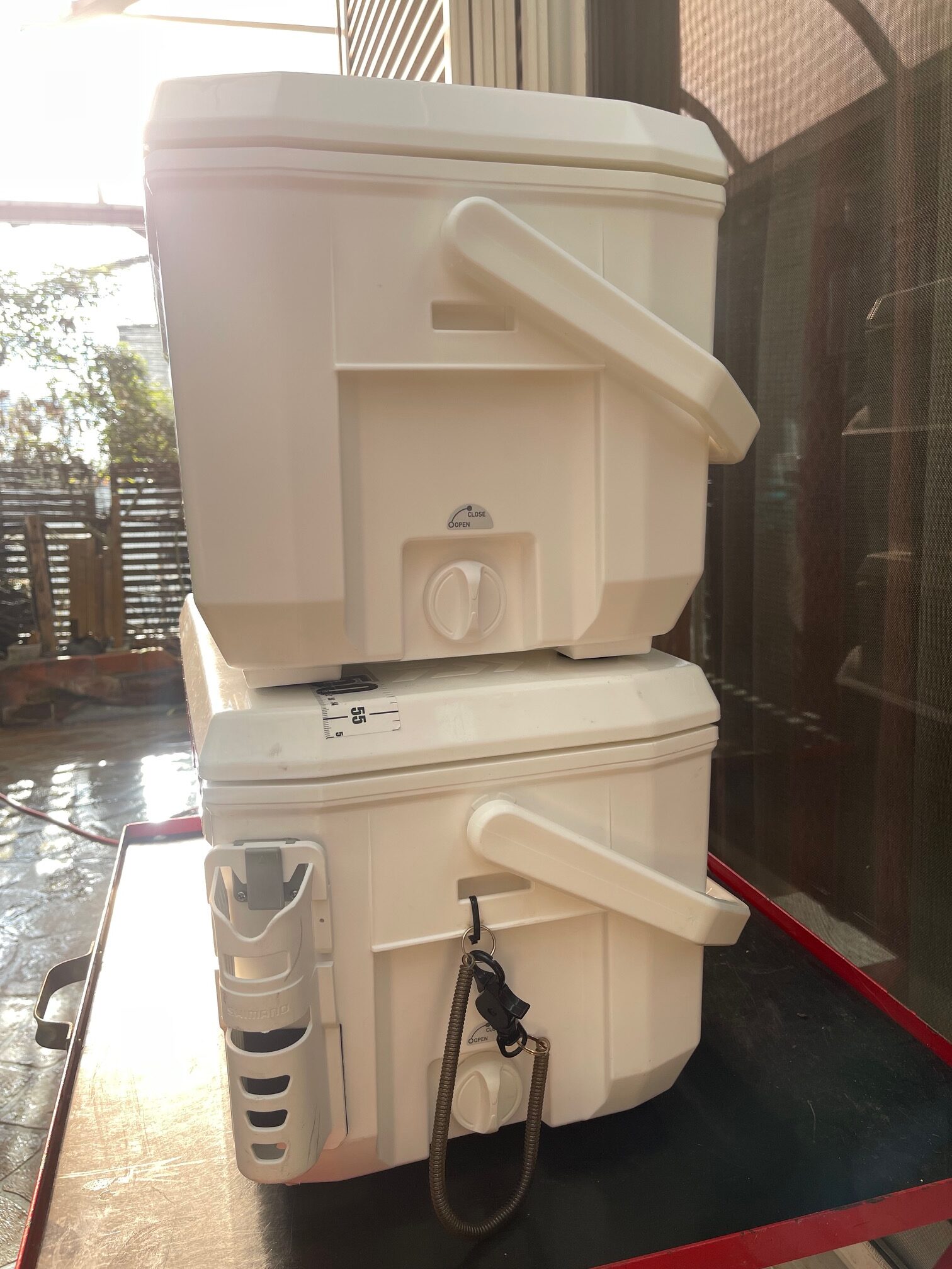 氷を入れて普通に釣りをする分なら夏場でも日陰に置けば十分な性能ですが海上釣堀の餌クーラーとなると夏場の猛暑、筏の上で直射日光にさらされ冷凍餌は、6時間もすると溶けてしまいます。