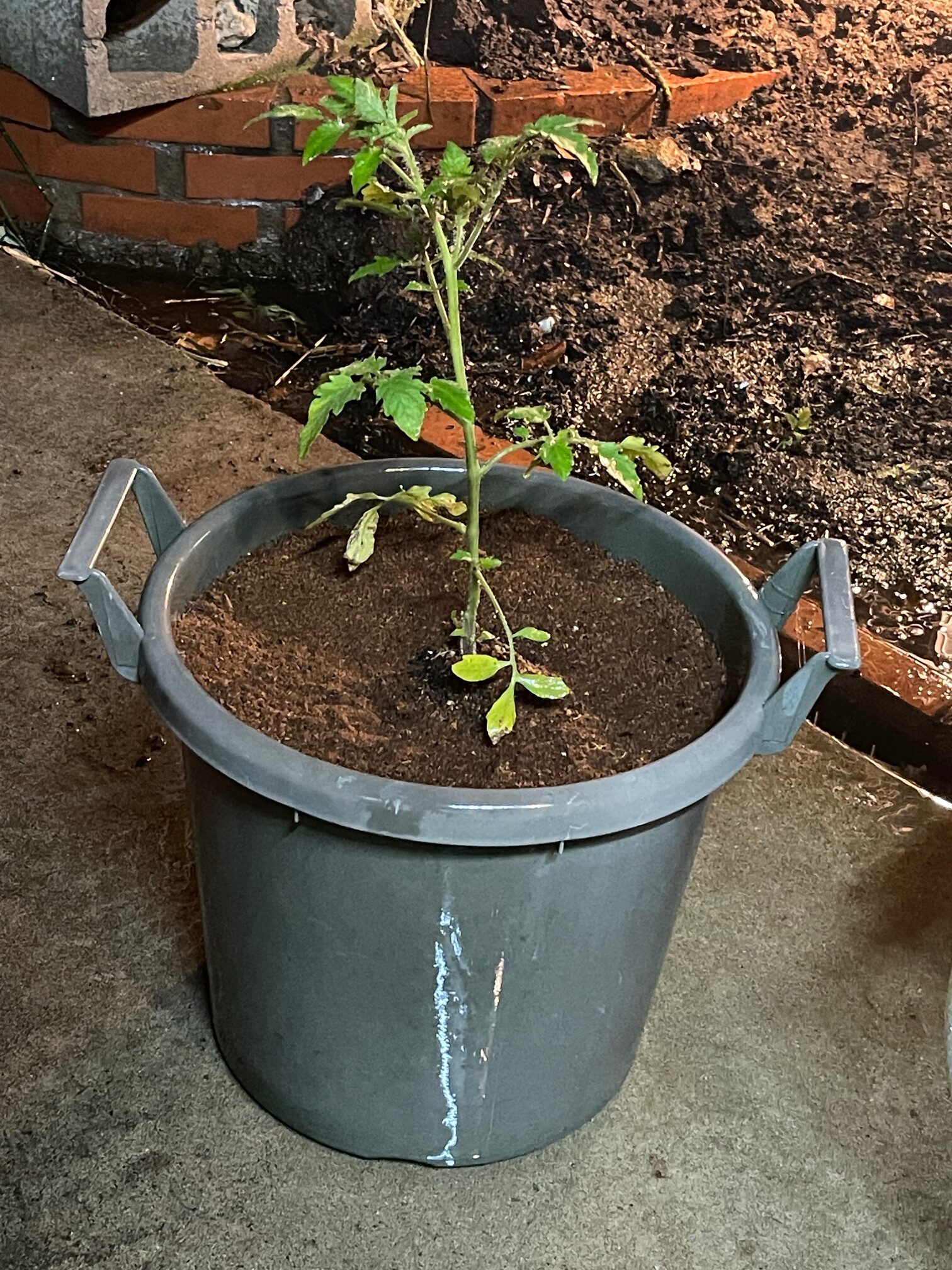 底の方は、普通の栽培土に肥料を混ぜて上に袋で育てるトマトの土を入れそこそこ育った苗木を植えました。