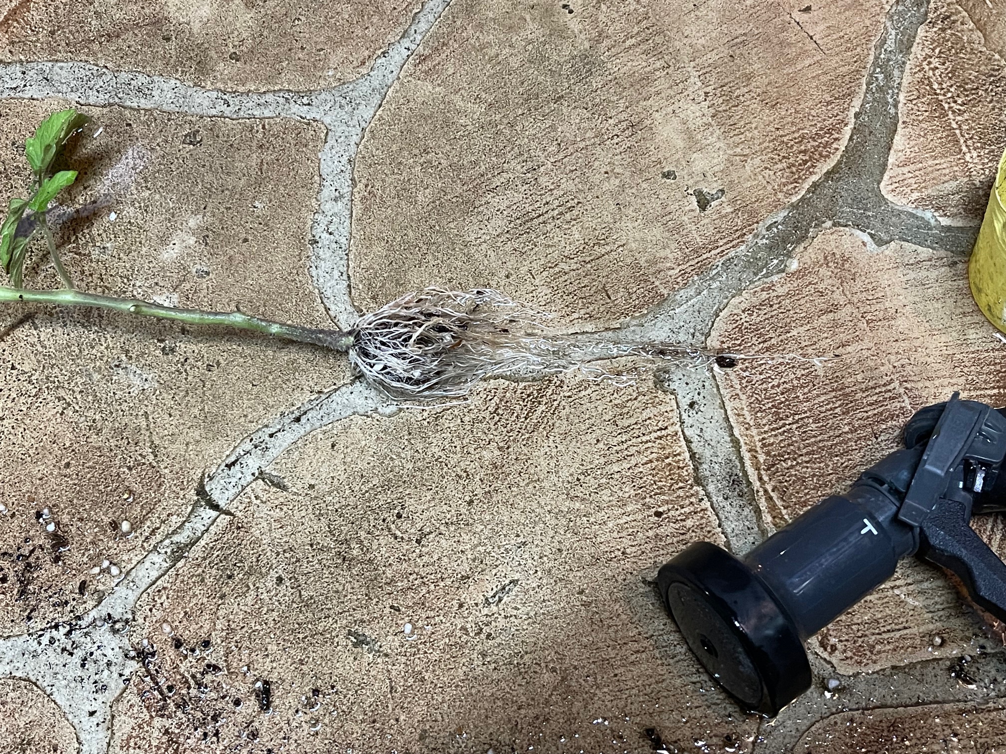 ミニトマトの苗を売られていたポッドから外し土を落として根だけにしました。