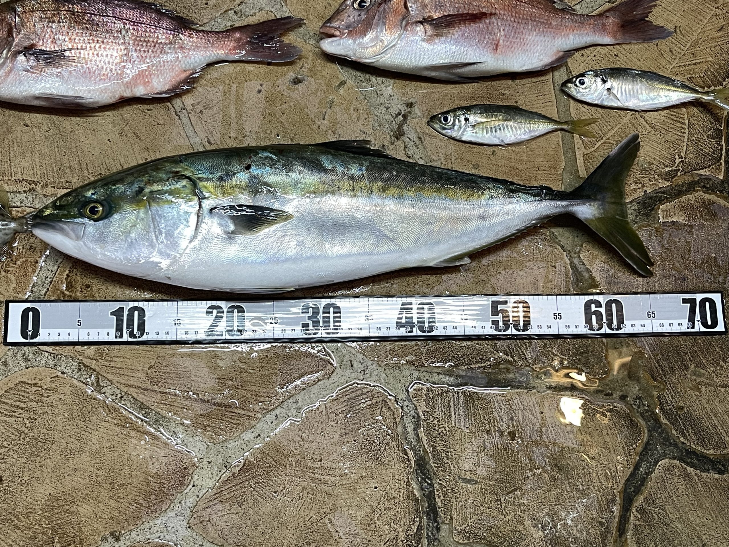 パパ:オリーブハマチ(メジロ)1匹 3点、真鯛4匹 4点、合計7点