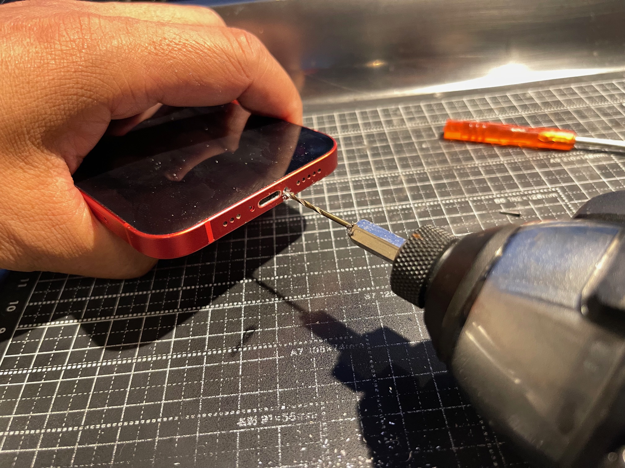 いきなりライトニングソケット横のネジをなめましたのでパネル開ける為にネジに穴開け。