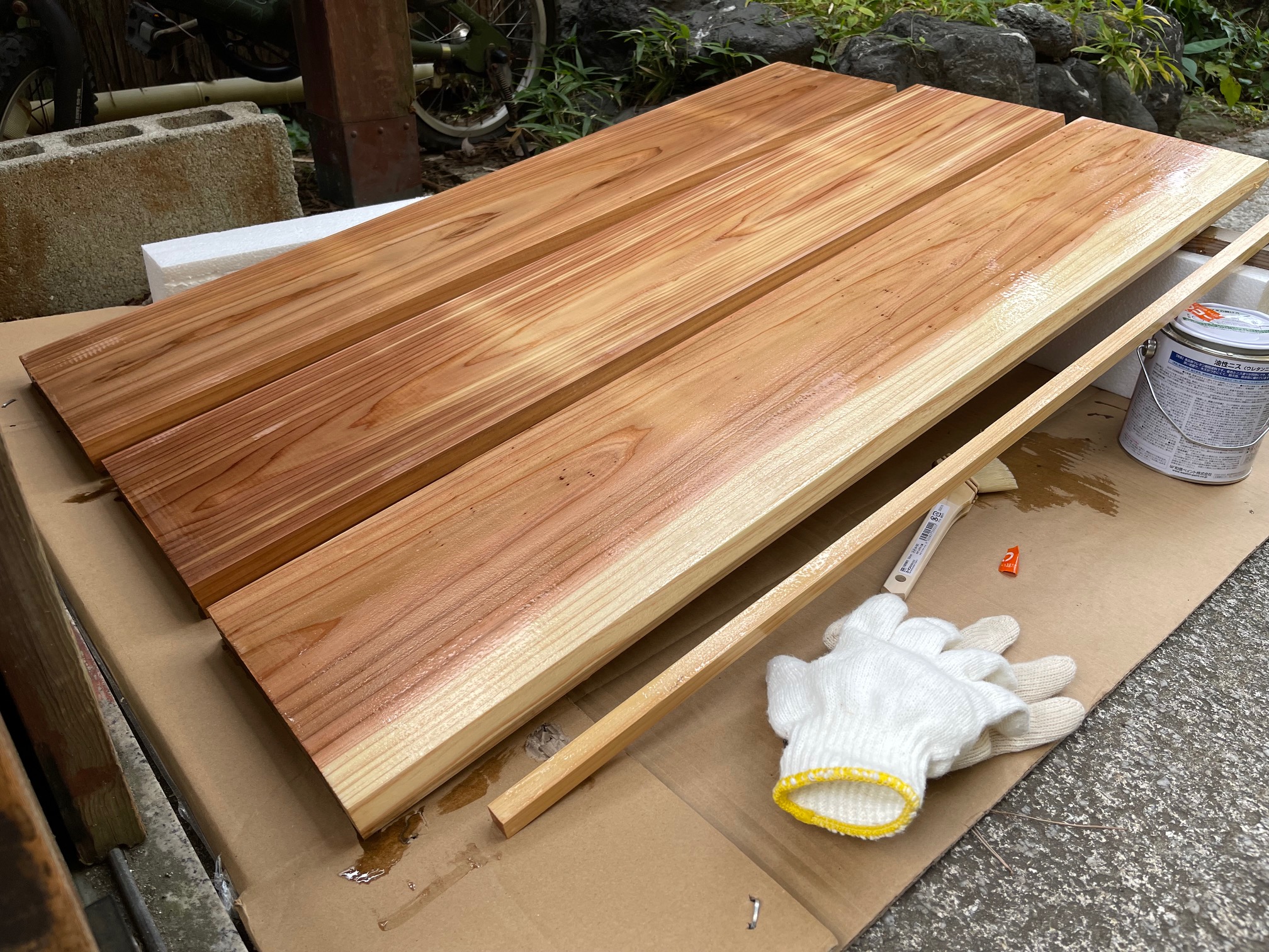 100cm×20cm×厚み3cmの杉板(フローリング材)1枚598円×3枚