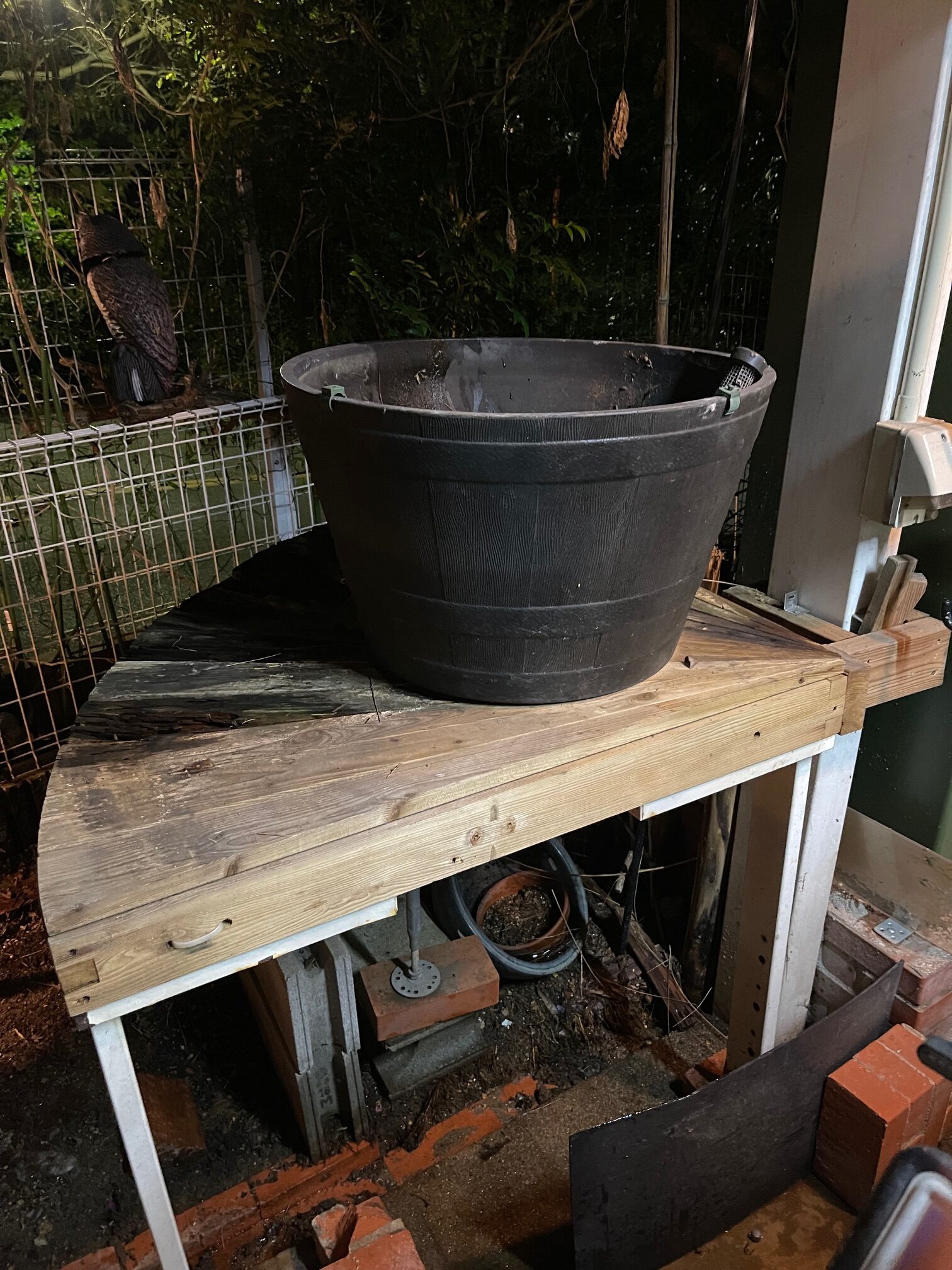 仕事から帰宅して本日は、オーバーフロー睡蓮鉢と台の撤去作業です。