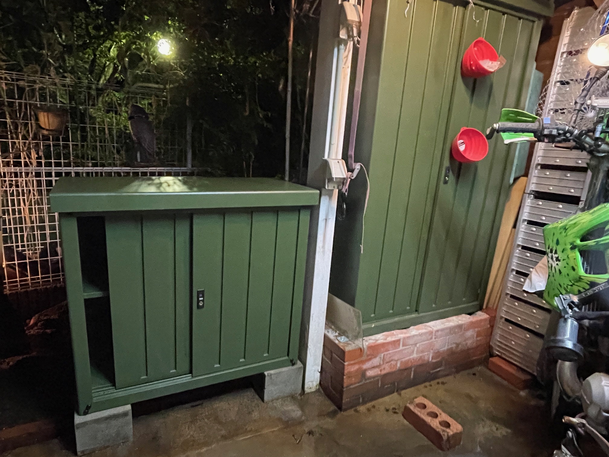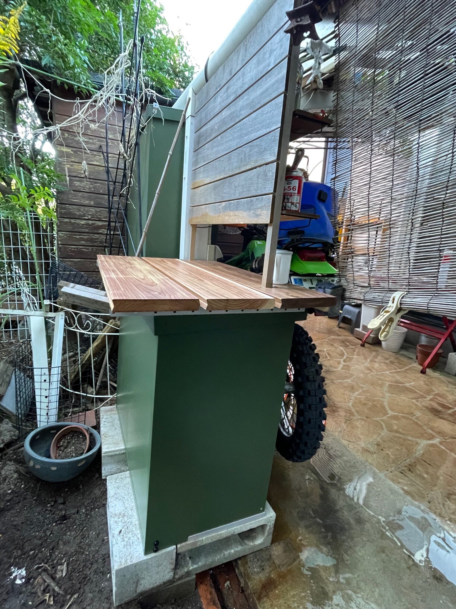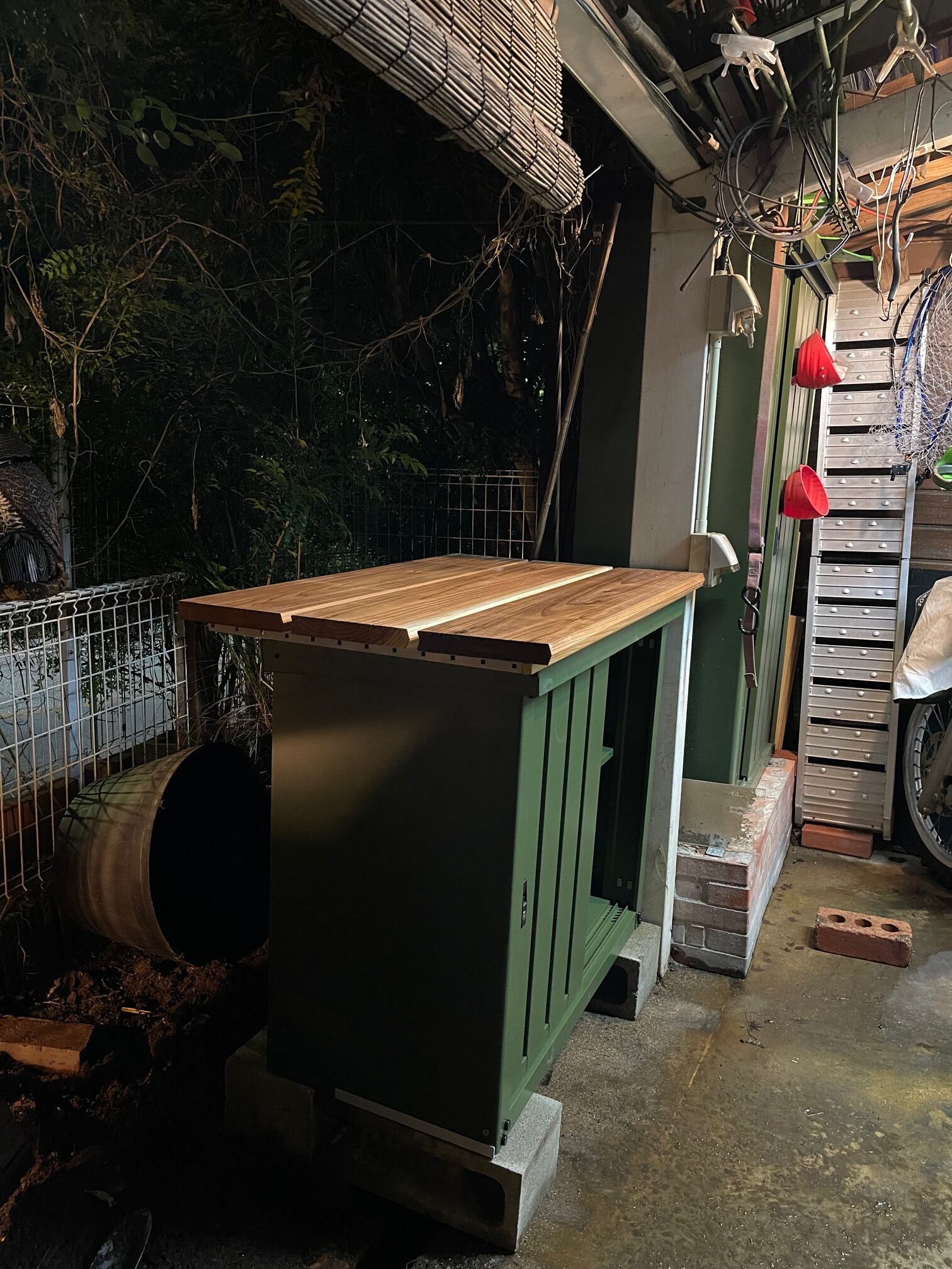 オーバーフロー大型睡蓮鉢廃止するのでココに物置を置くのですが上の棚は、便利なので残し物置お上にちょっとした植木鉢など置けたら最高です。