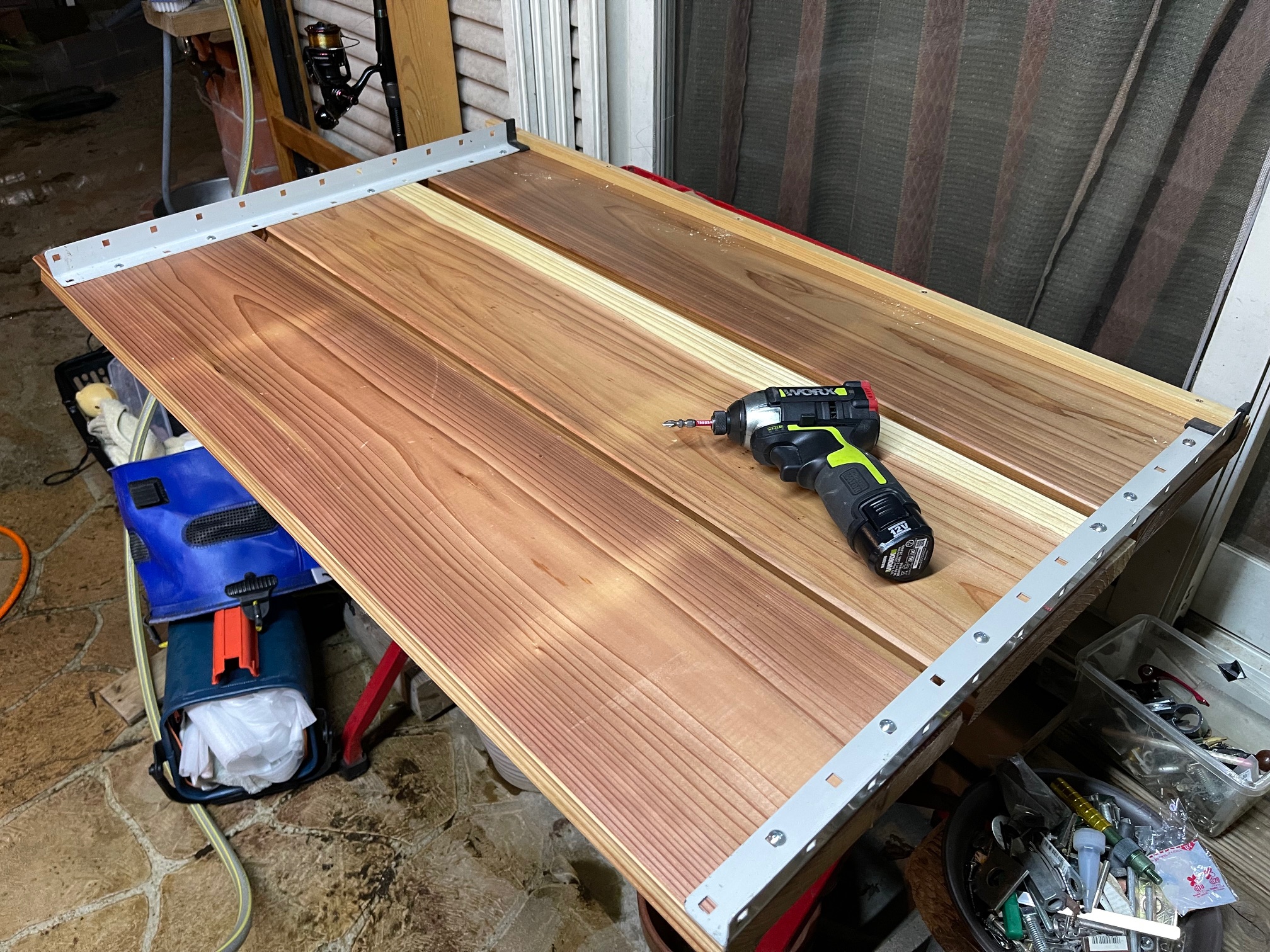 物置を置いて大丈夫そうなので次は、物置の上に置く天板を作ります。