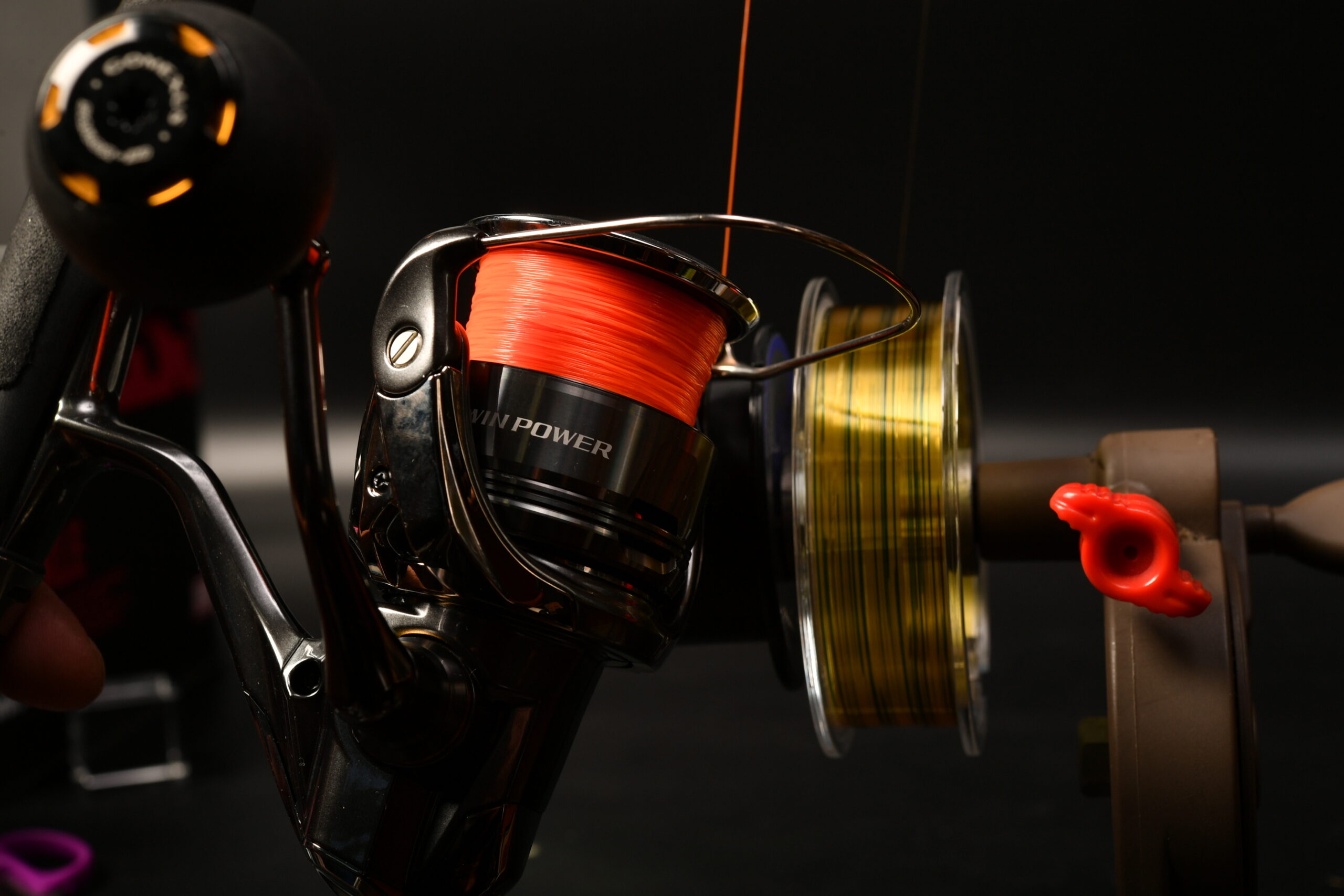 高速リサイクラーで巻いていきますがこの時、ナイロンラインの場合テンションかけすぎるとヨレヨレになりやすいのでブレーキは、少しだけしか掛けません。