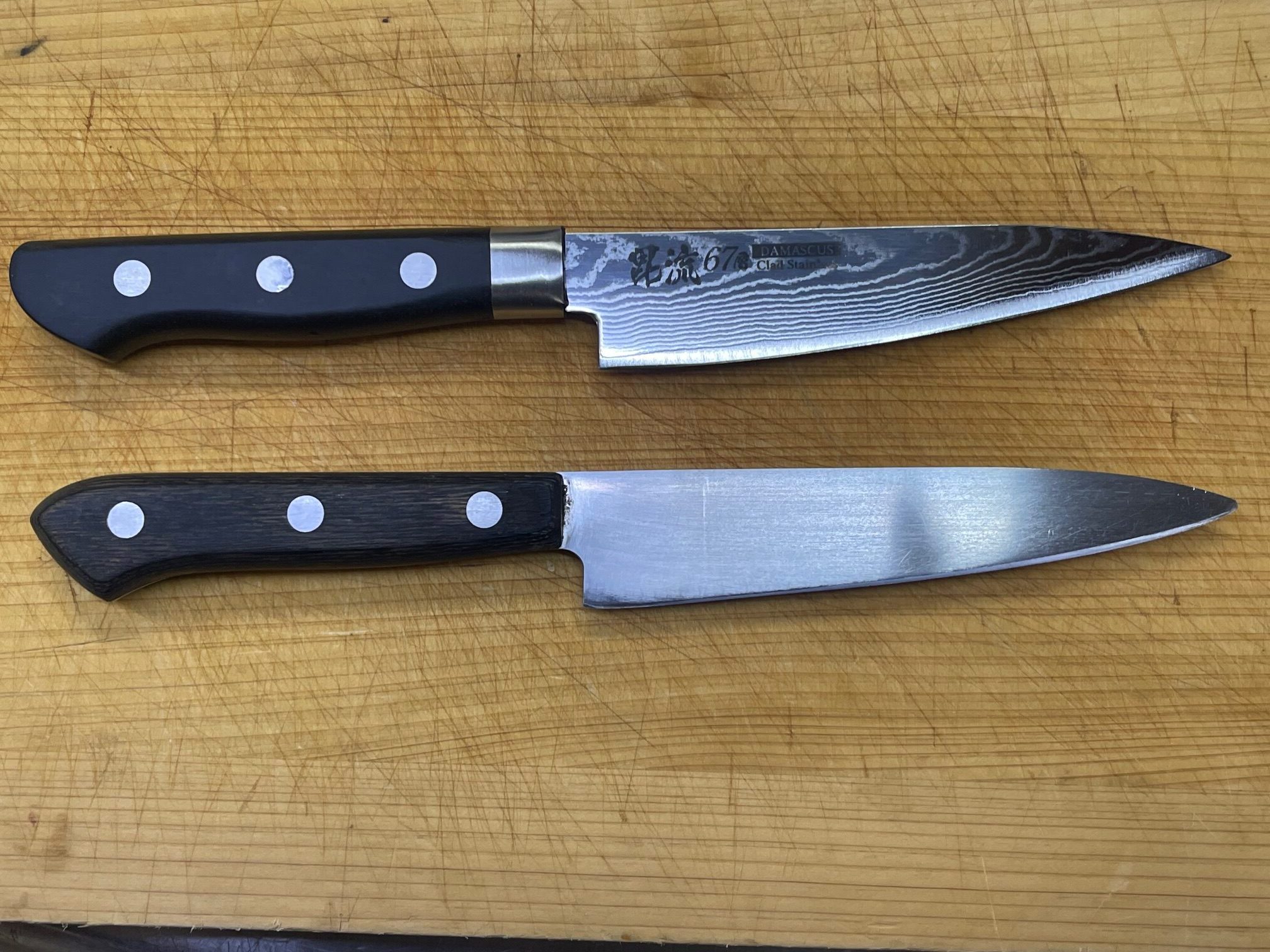 先代が購入したペティーナイフ2本を使っていますが写真の物は、割込無しのステンレスナイフで全く切れない代物。