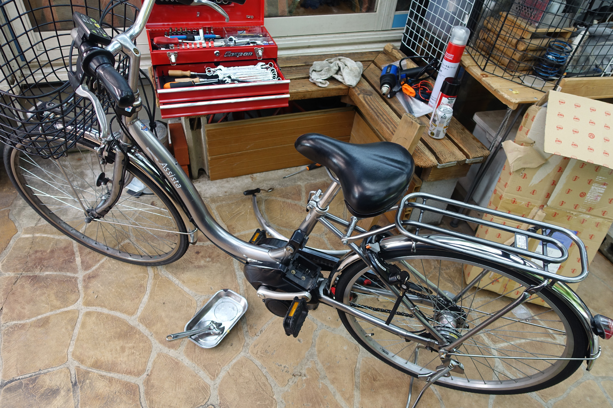 アシスタUは、ペダルの辺にモーター入りギアボックスが有りモーターの力は、チェーンを通して後輪に伝わりアシストされます。