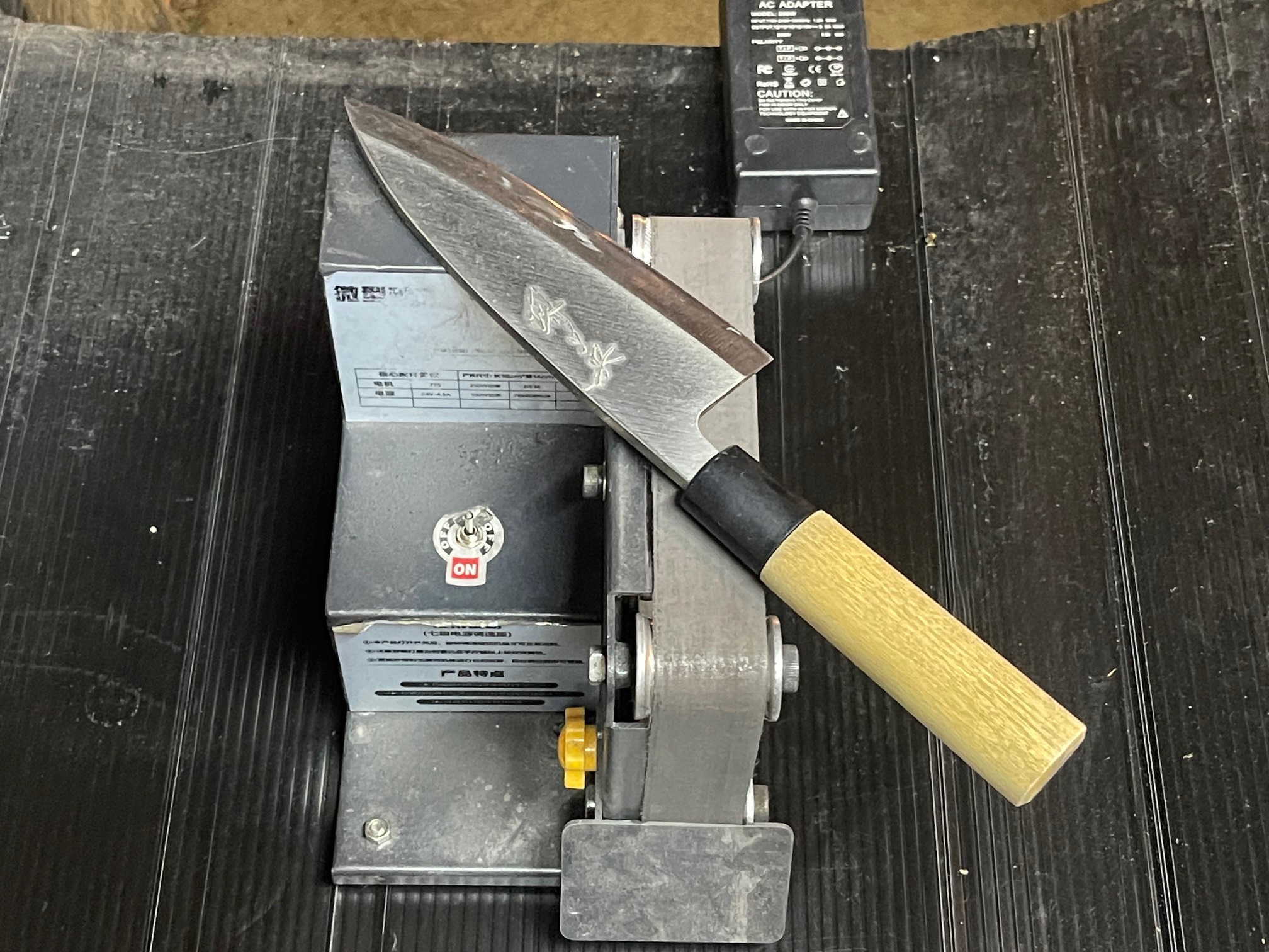 このミニベルトサンダーは、低速にすると電動ですがかなりゆっくりになり手で研ぐスピードと変わらないので柔らかい鉄の包丁でも熱を持たさずじっくり研ぐ事が可能なんです。