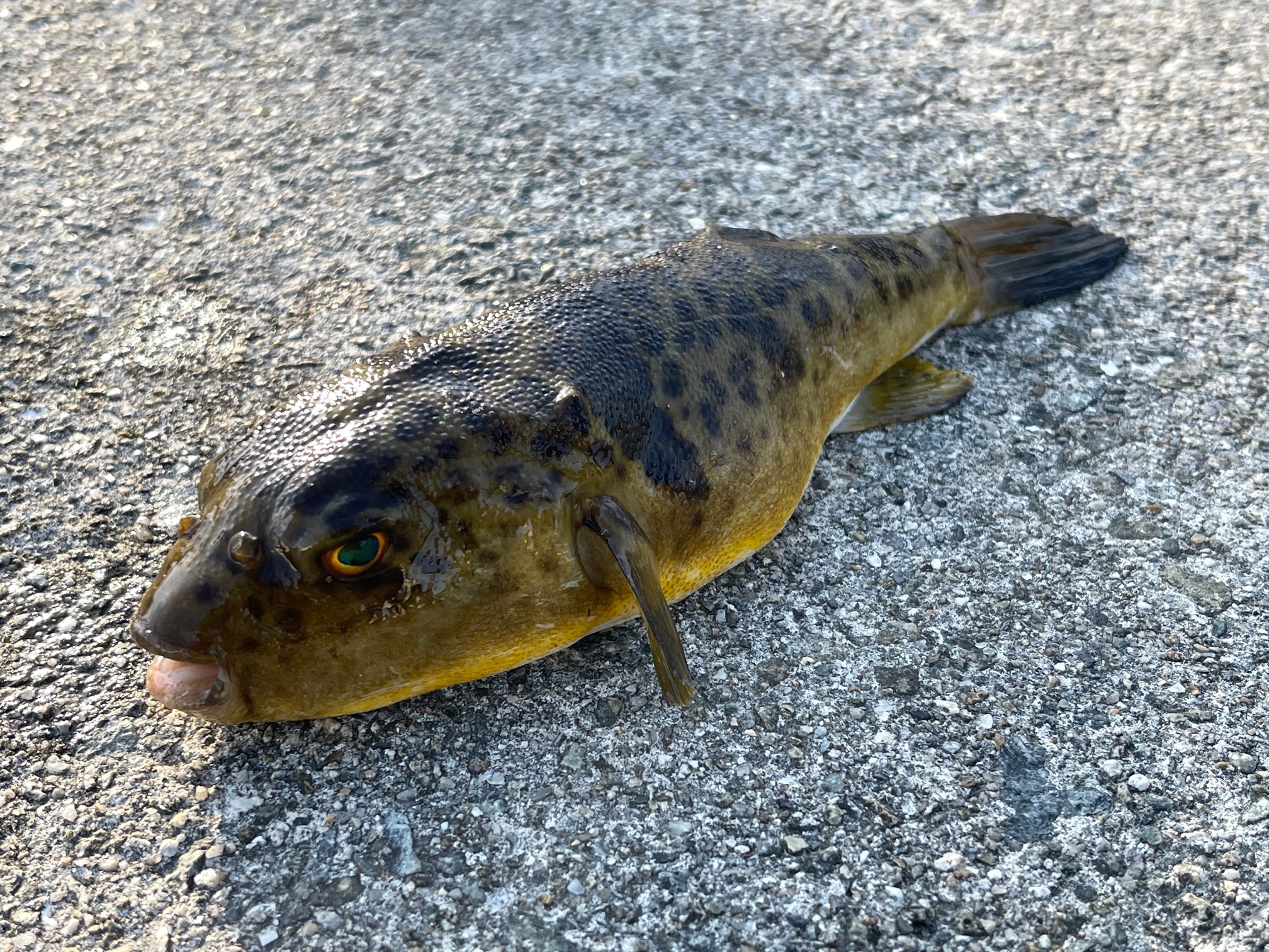 次女が大きめの魚を釣ったと思いきや25cm位のヒガンフグ(アカメフグ)でした。